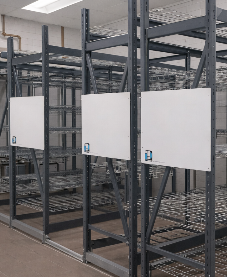 Dry erase boards that attach directly to shelving units to improve visibility, organization, and product retrieval time.